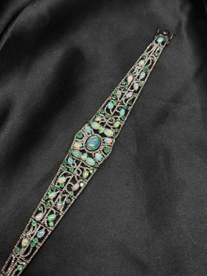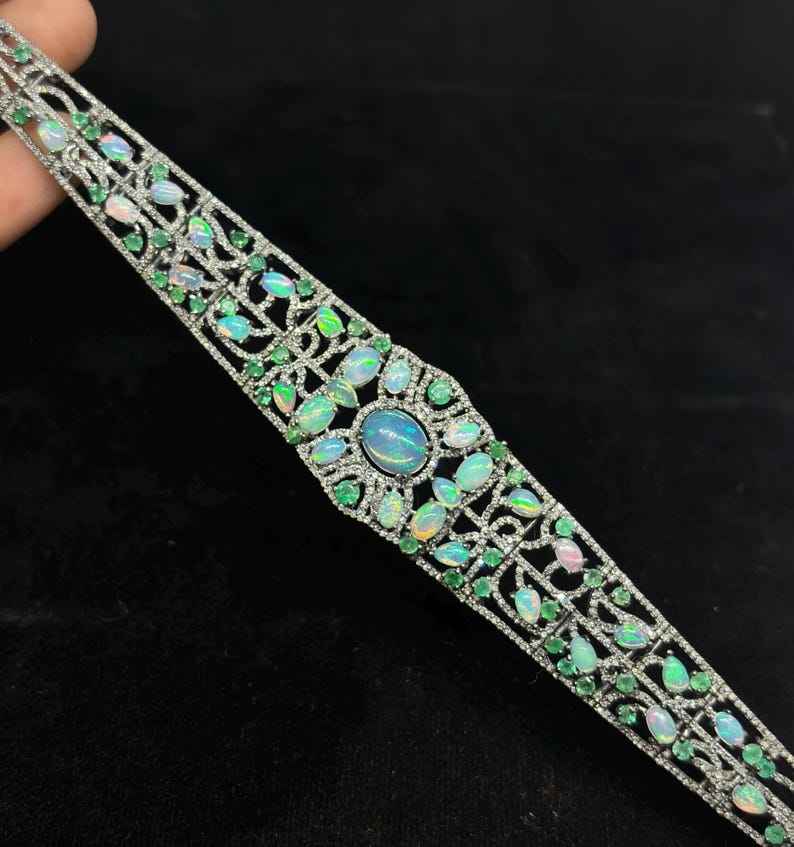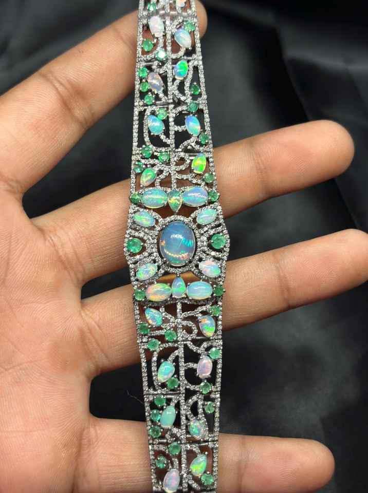 Ethiopian Opal Emerald Diamond Bracelet Rose Cut Pave 925 Sterling Silver Gemstone Jewelry Gift For Her Handmade
