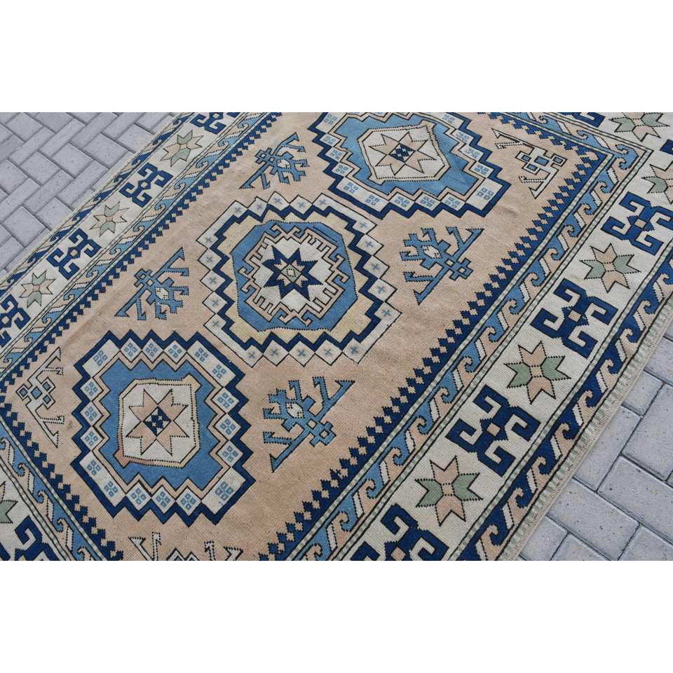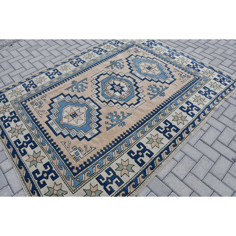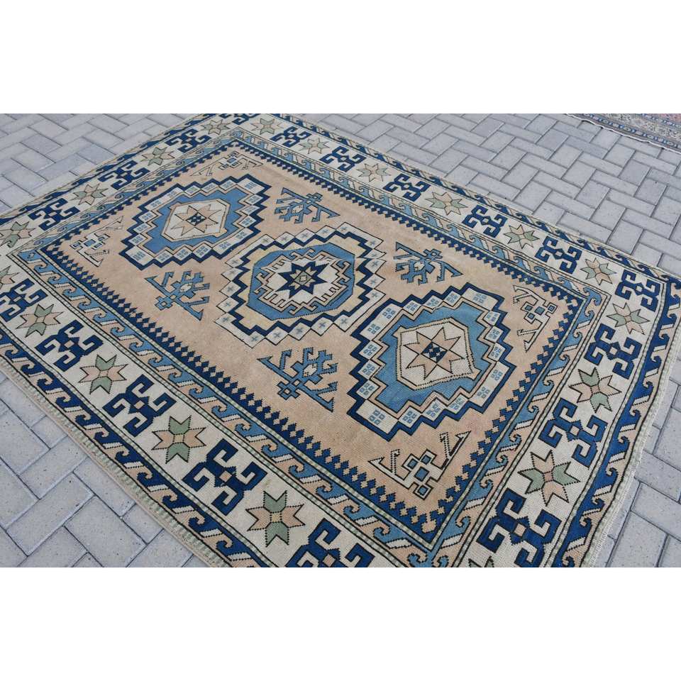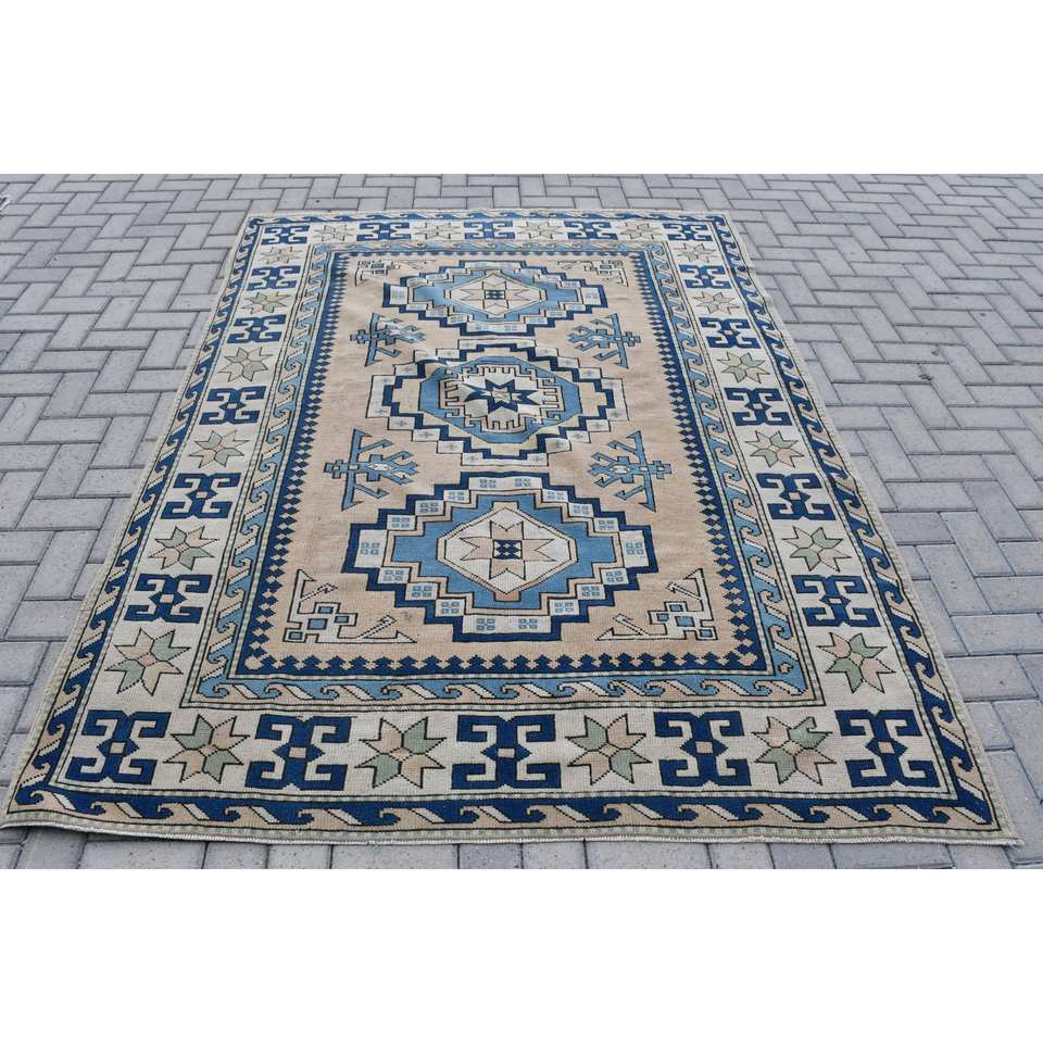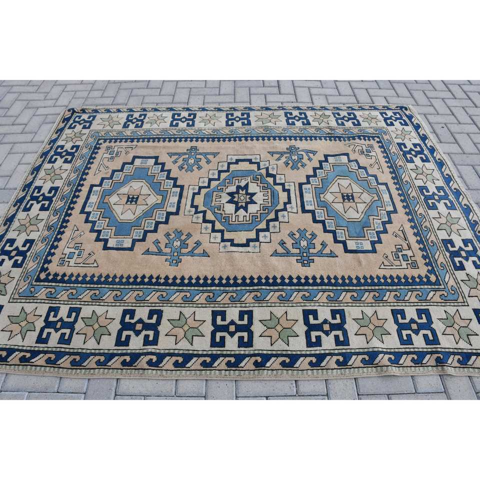 Ethnique 5.7 X 7.6ft Bleu Beige Laine Polyester Tapis Turc Fait À La Main Classique Rectangle Patchwork Conception Latex Support pour Vivre