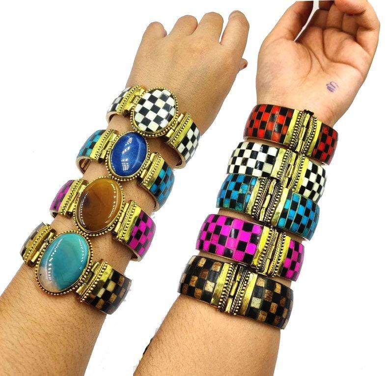 Bracelet manchette ethnique en laiton incrusté de os, fait main, accessoire de mode