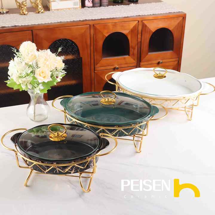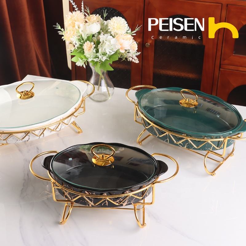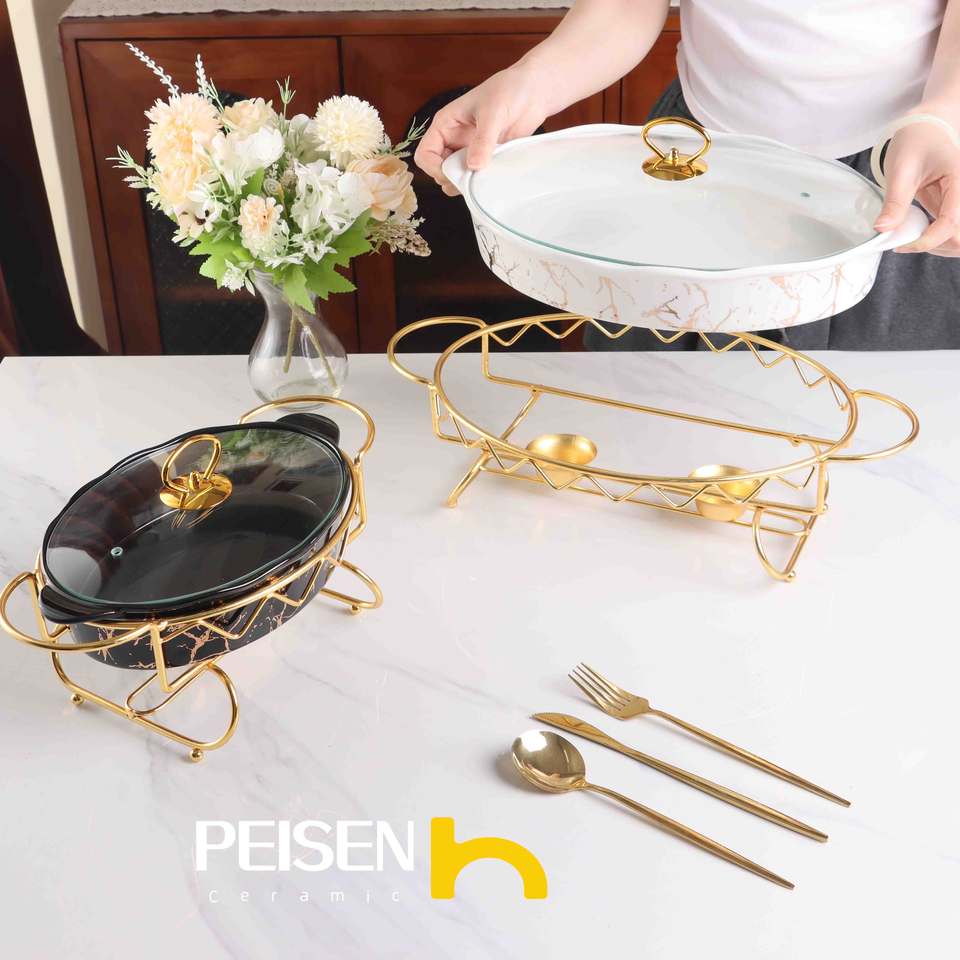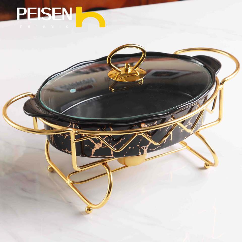 Nouvelle casserole en céramique ovale dorée de style européen avec support en fer Pot à soupe élégant pour buffet