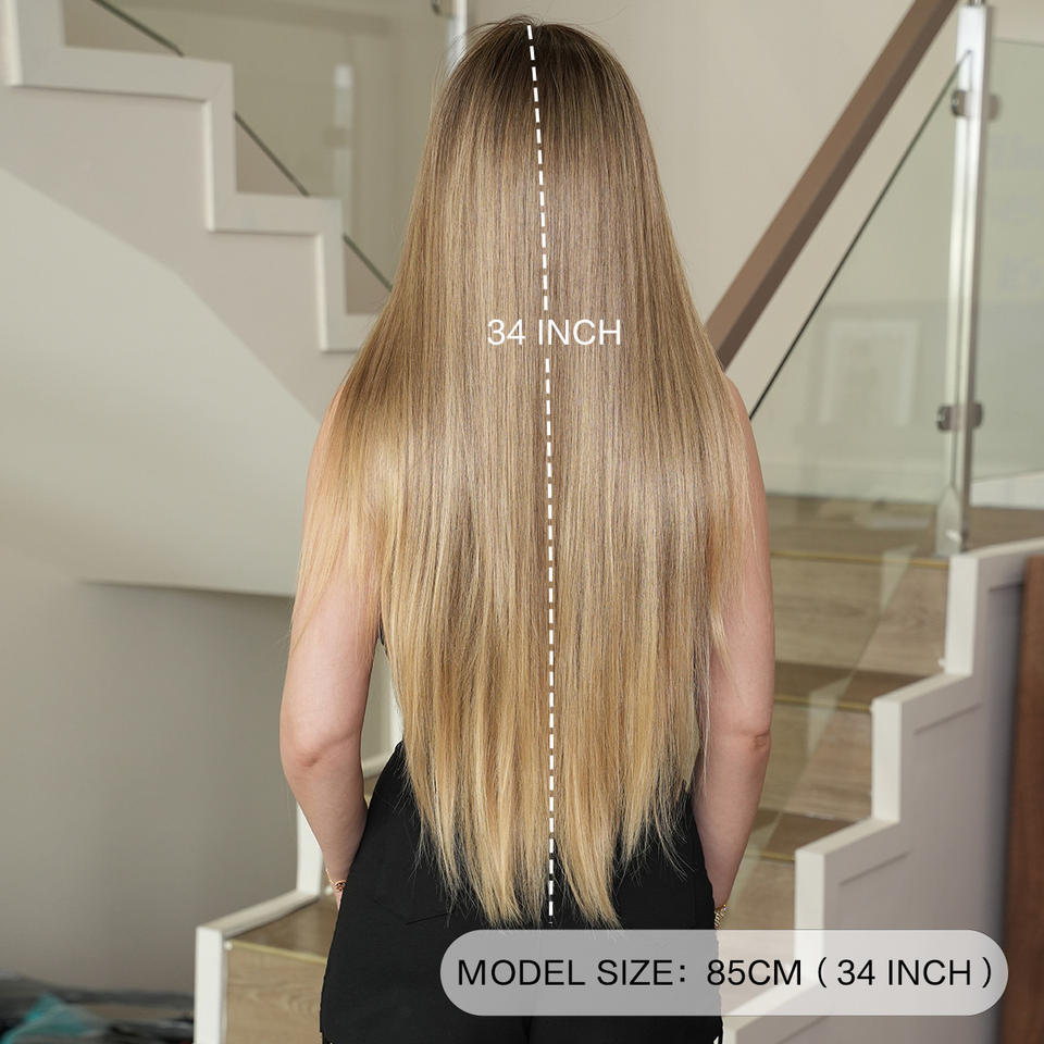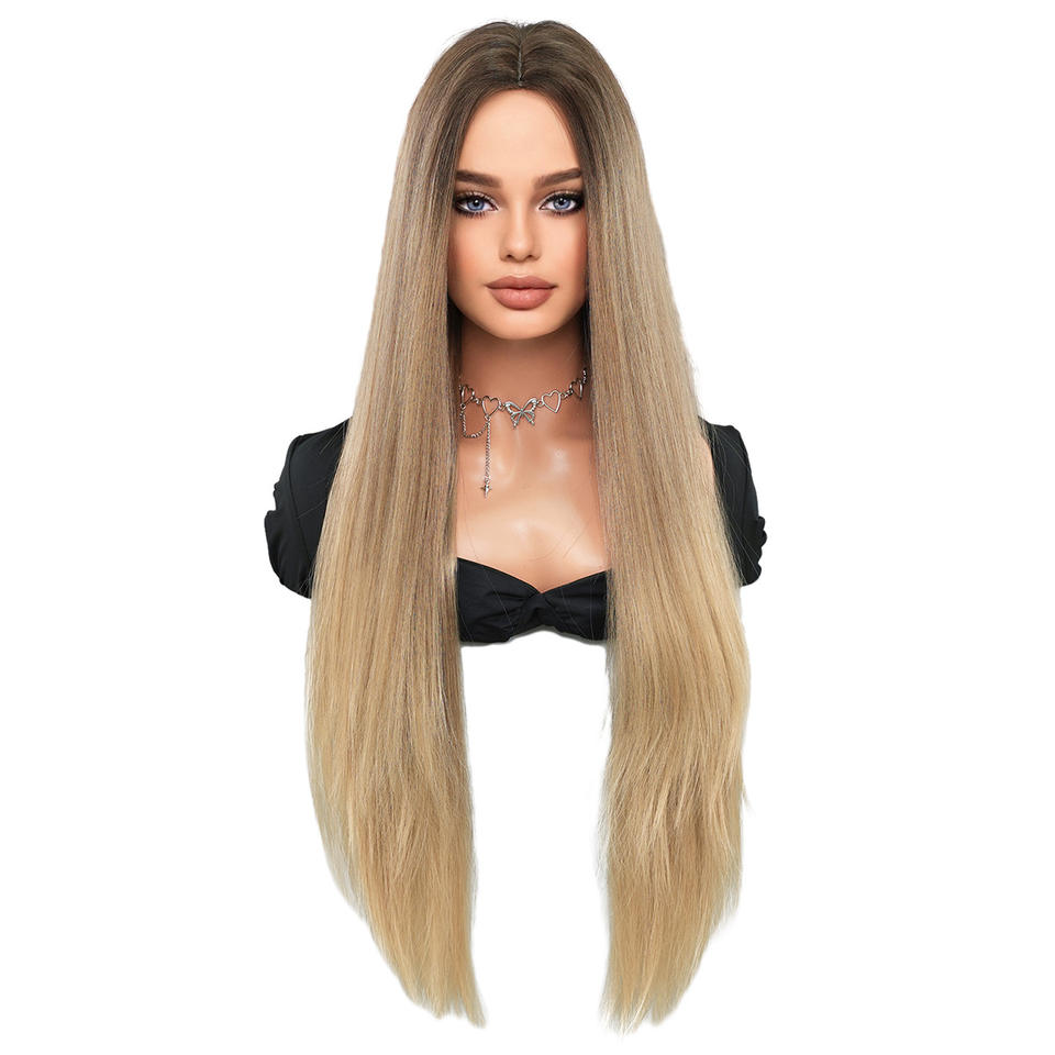 Perruques synthétiques longues à raie médiane, style Europe et Amérique, cheveux raides, couvrant entièrement la tête, en fibre dégradée or naturel, pour femmes