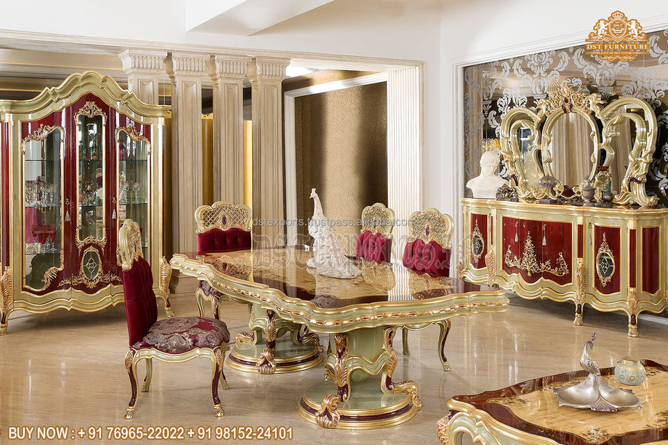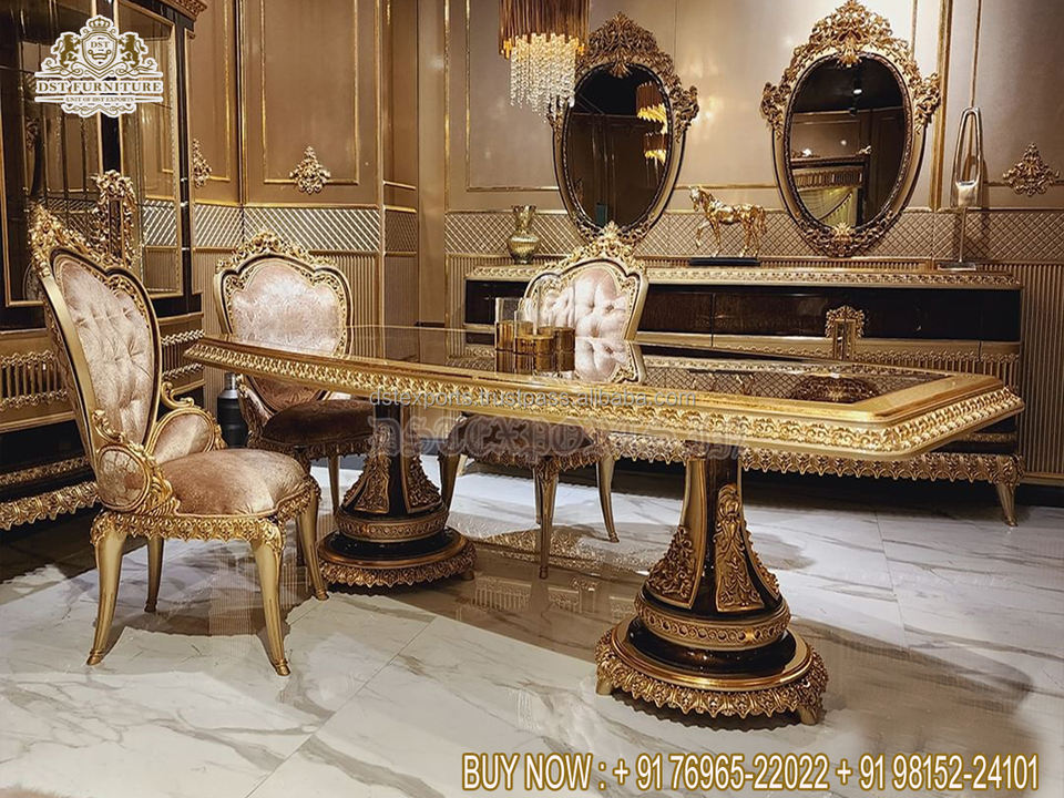 Ensemble de table à manger élégant européen de 9 pièces, ensemble de table à manger classique en bois sculpté à la main doré, ensemble de salle à manger sculpté à la main américain, États-Unis