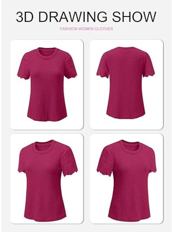 European American 2025 Womens Frenchy Summer Tops Crewneck Short Sleeve T Shirts Casual Waffle Knit Jacquard Blouses Top Shirts