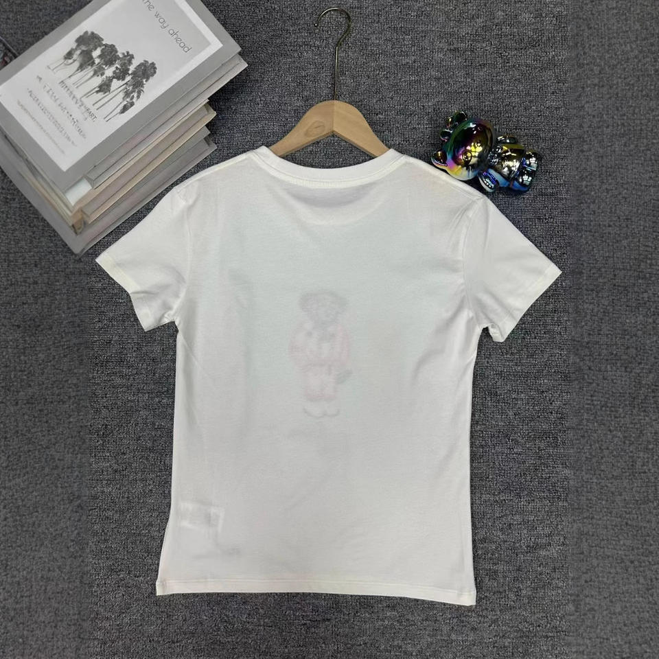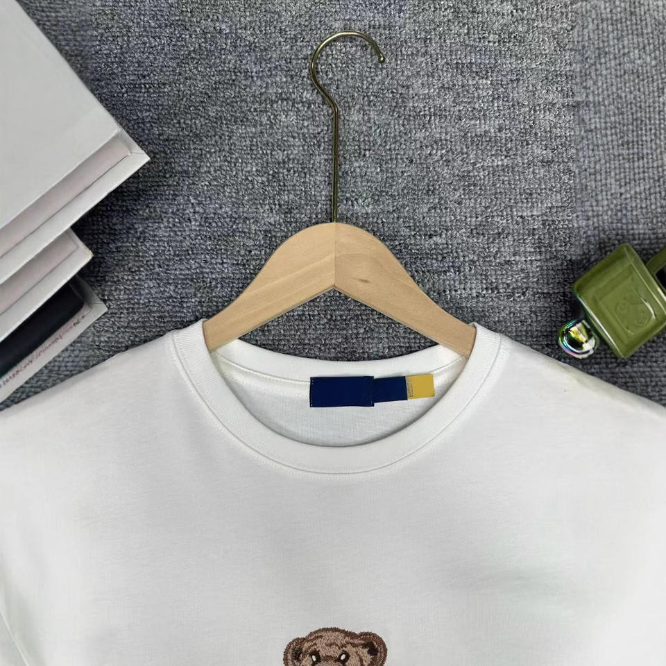 T-shirt décontracté blanc à col rond en coton pur avec broderie 3D effet poudre motif petit ours R~L style européen-américain