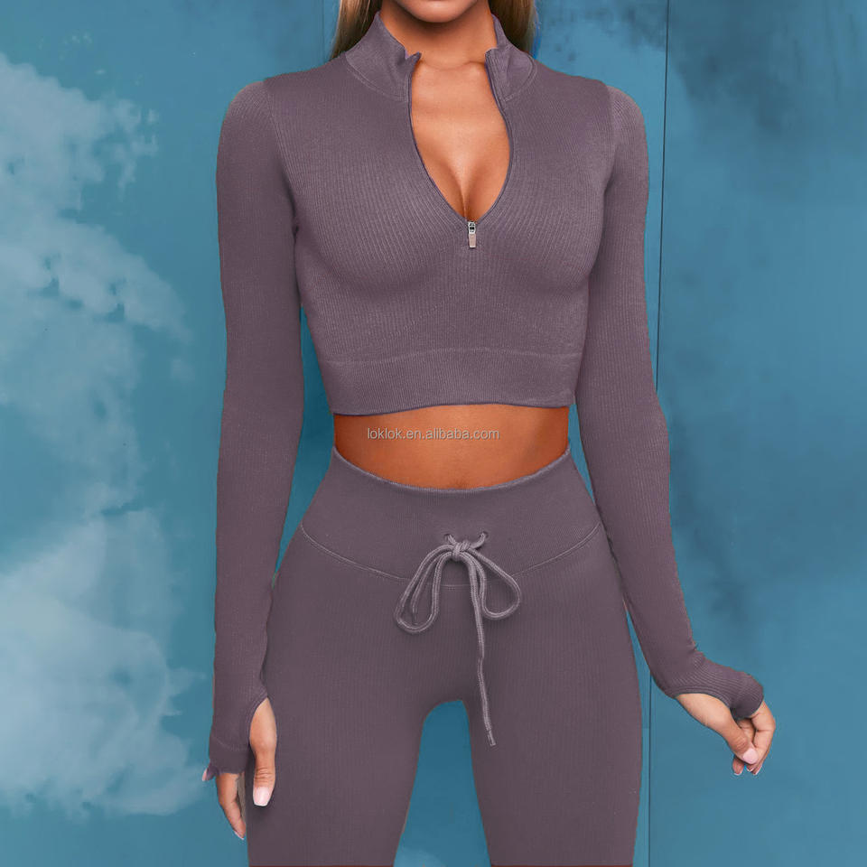 Ensemble de vêtements de sport pour femmes européennes et américaines, pantalon de course à manches longues, taille haute, sans couture, fermeture éclair, vêtements de fitness, ensembles de yoga