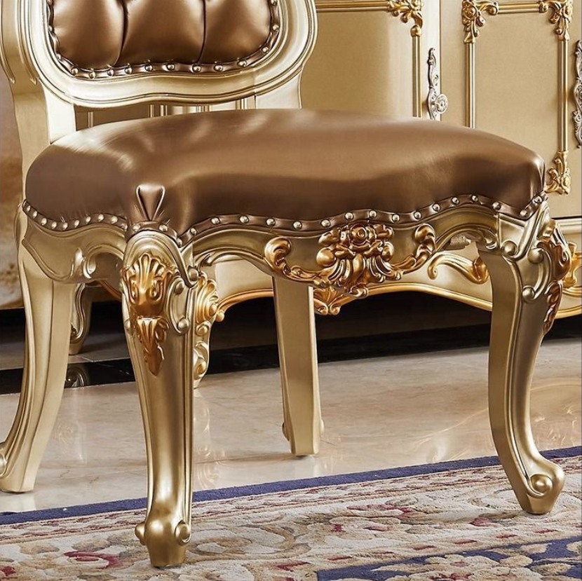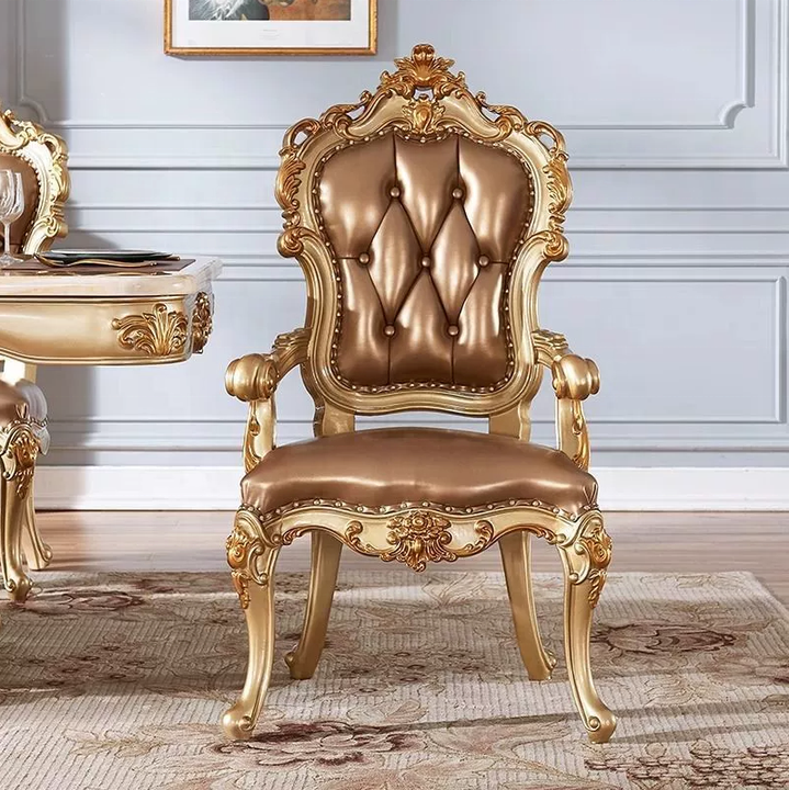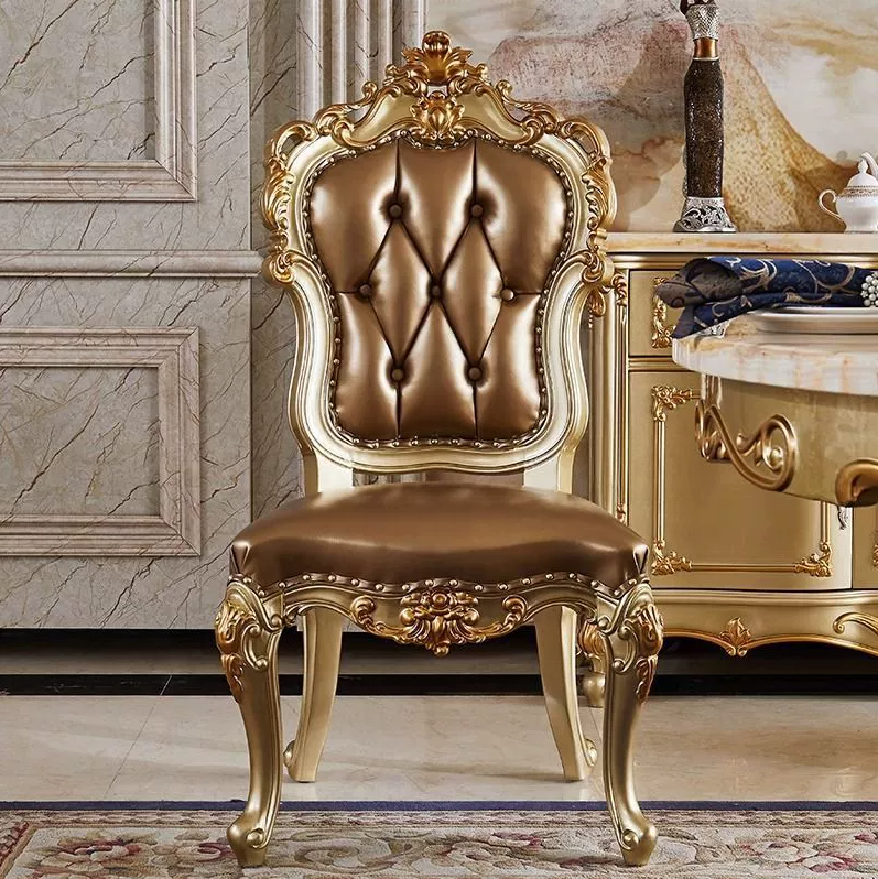 Chaises de salle à manger classiques européennes de luxe en bois massif avec accoudoirs dorés, meubles de restaurant en bois massif et cuir véritable pour la maison
