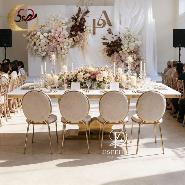 Table de salle à manger de luxe européenne en acier inoxydable doré avec plateau en MDF et plateau en verre, idéale pour les mariages et l'utilisation en hôtel moderne