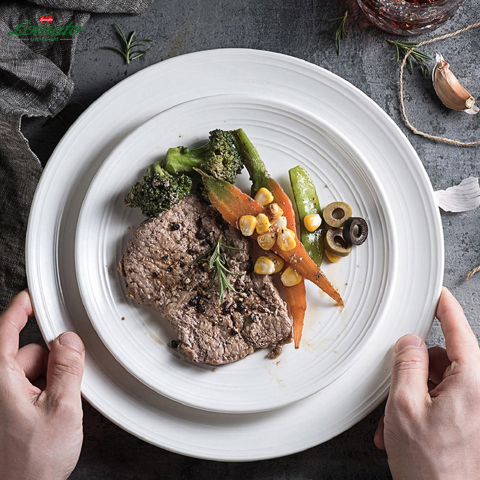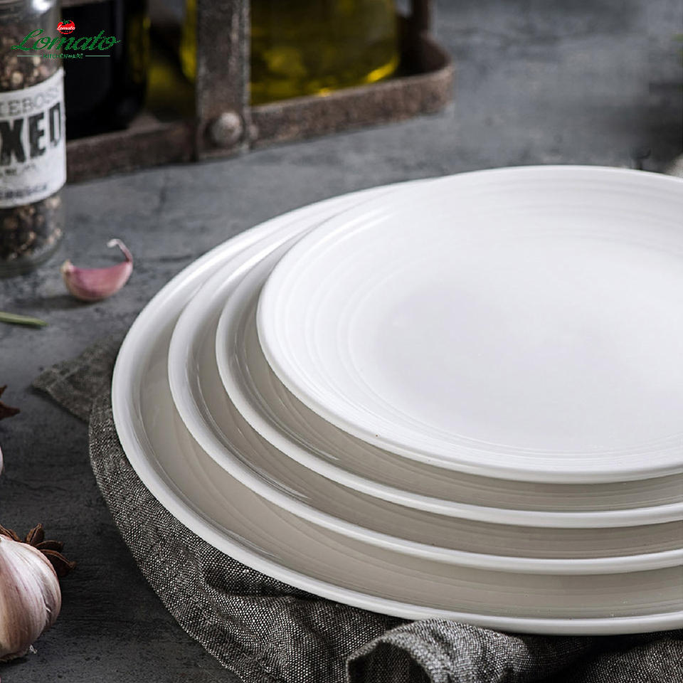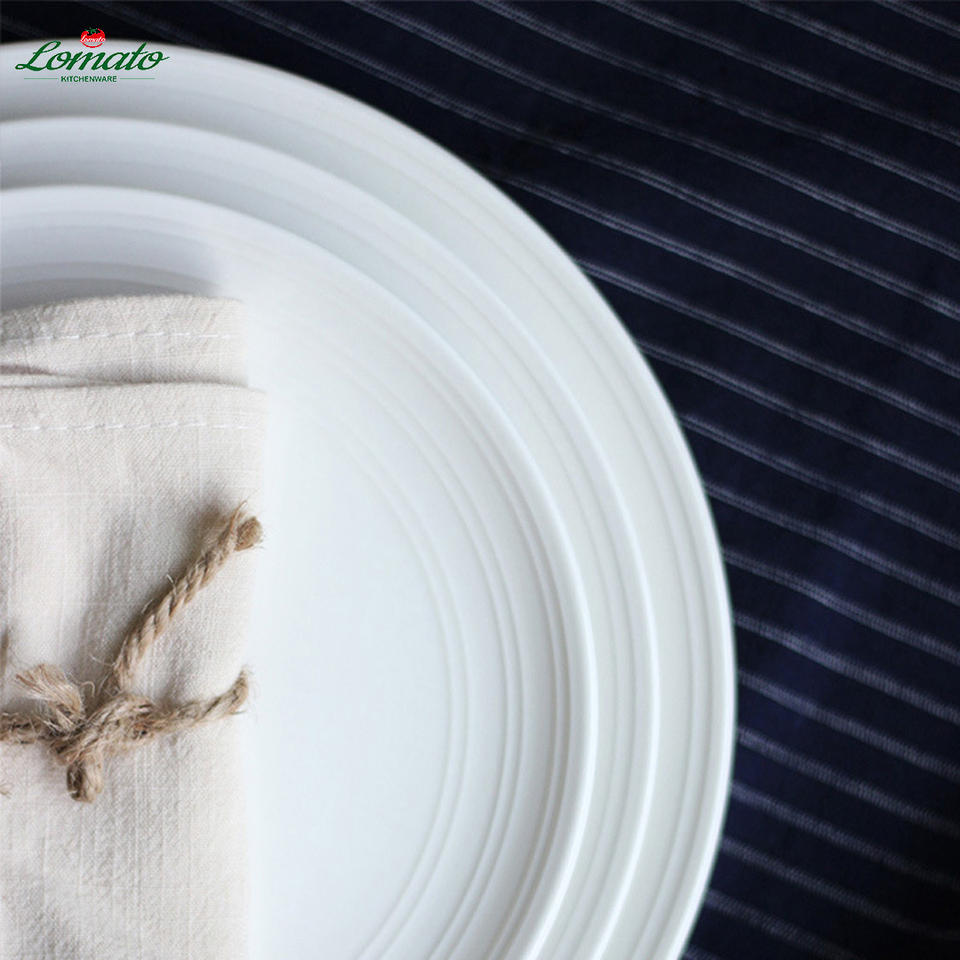 Assiette ronde en céramique minimaliste européenne avec texture lignée, assiette à dîner en porcelaine blanche, logo personnalisé, restaurant, hôtel, restauration