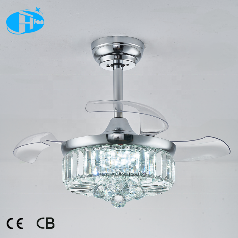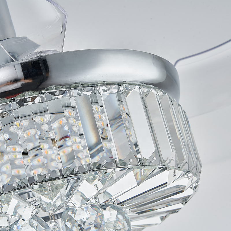Ventilateur de plafond en cristal au design moderne européen, lumière LED blanc chaud et télécommande argentée, lustre DC 40W avec fonctions rétractables