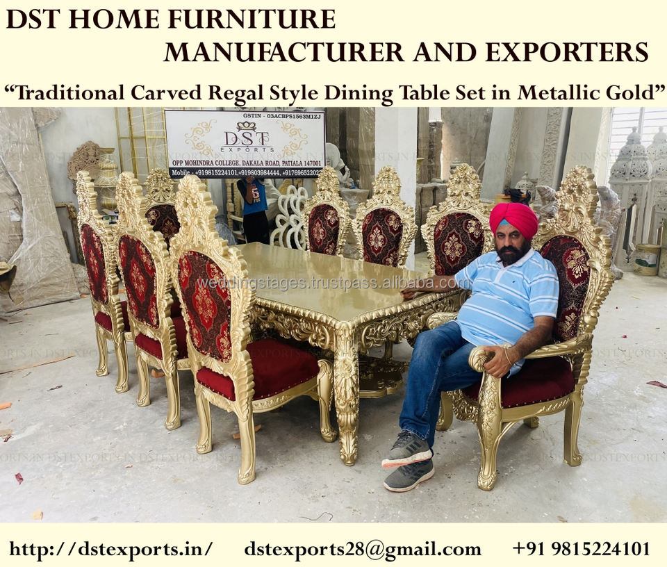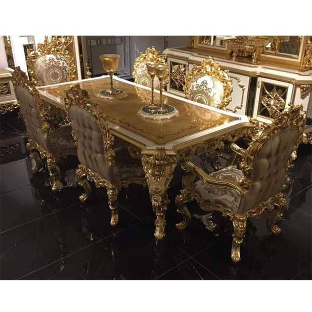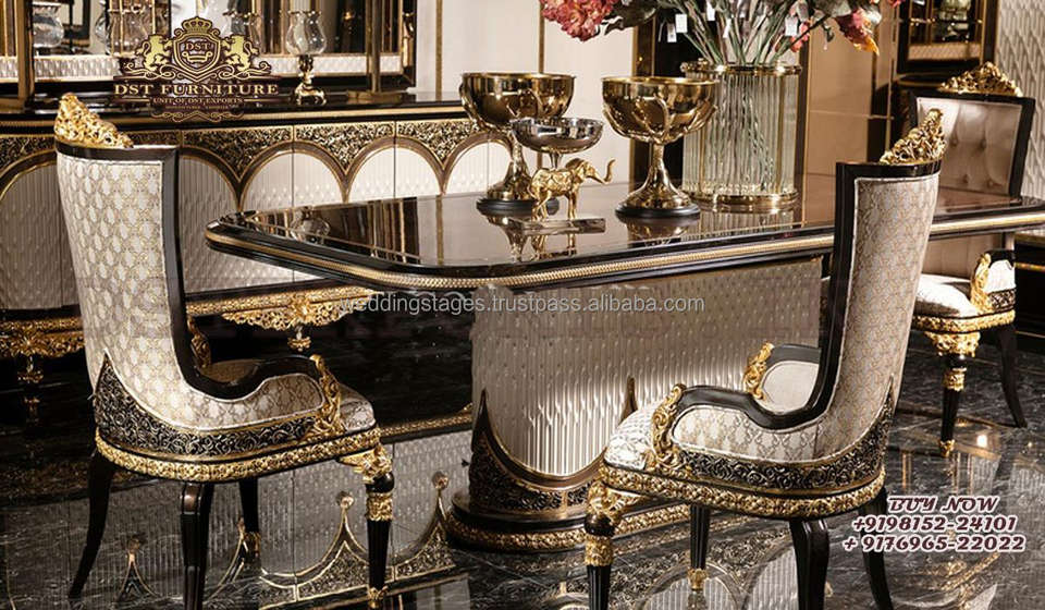Ensemble de table à manger de luxe en teck massif européen, moderne, sculpté à la main, finition dorée, durable, taille personnalisable
