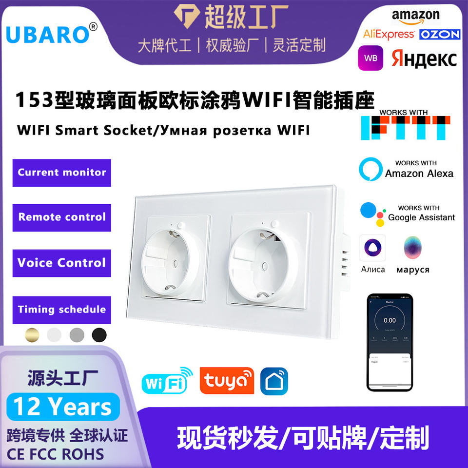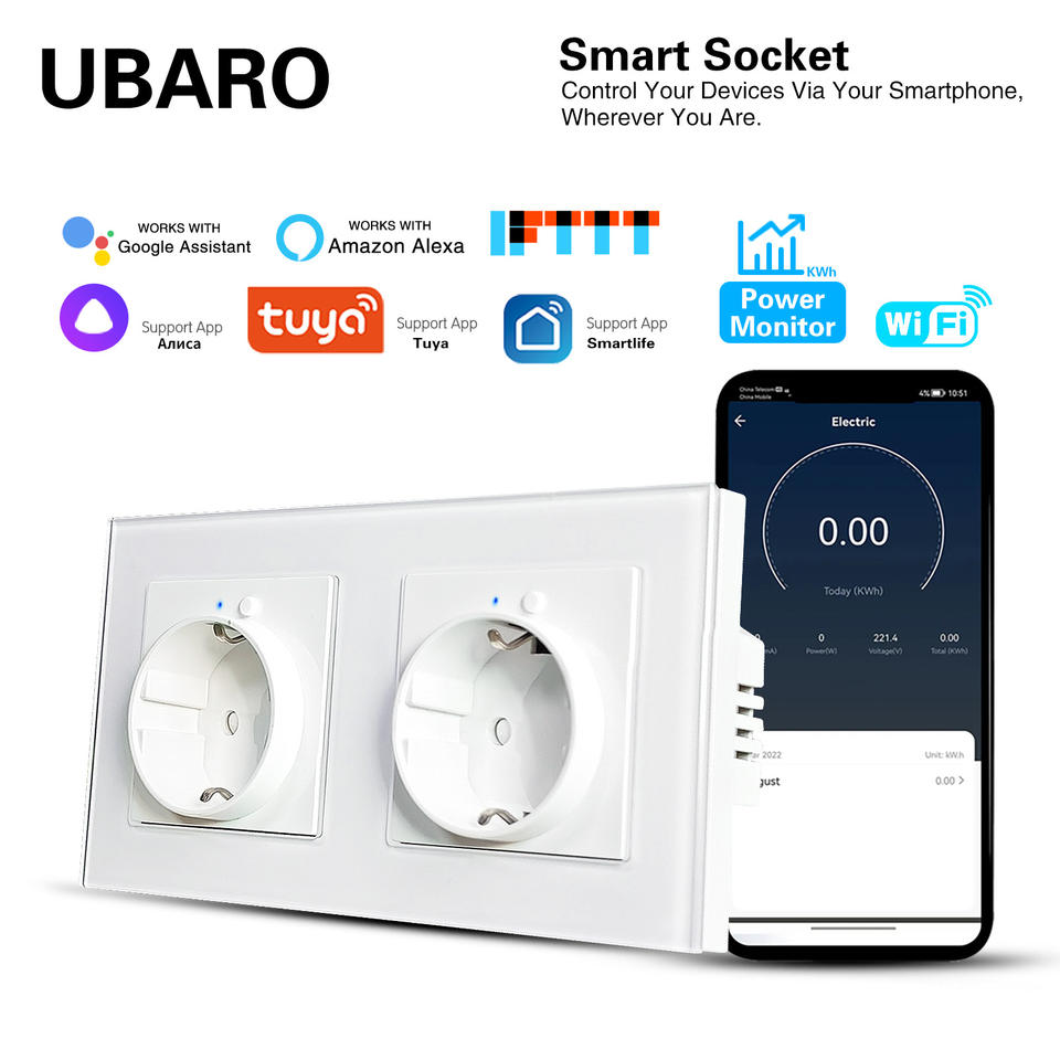 Prise murale intelligente Wifi standard européenne 16A avec panneau en verre trempé, prise EU, commande vocale et fonction minuterie