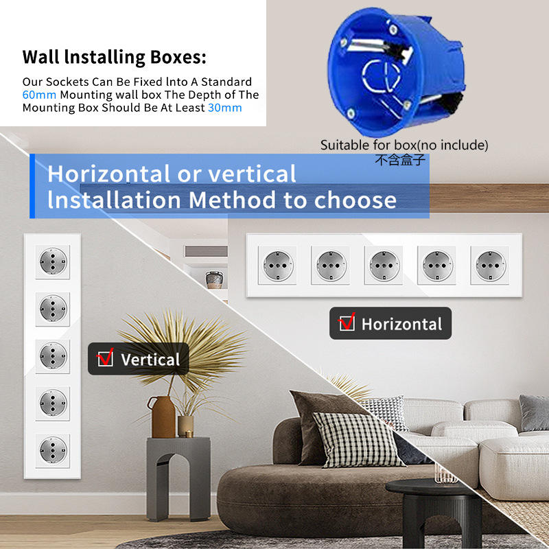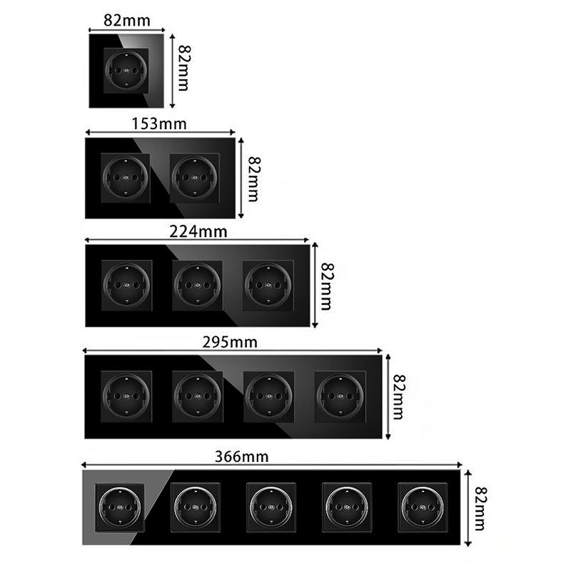 Prise murale standard européenne type 82, panneau en verre trempé, montage encastré avec griffes pour boîte ronde