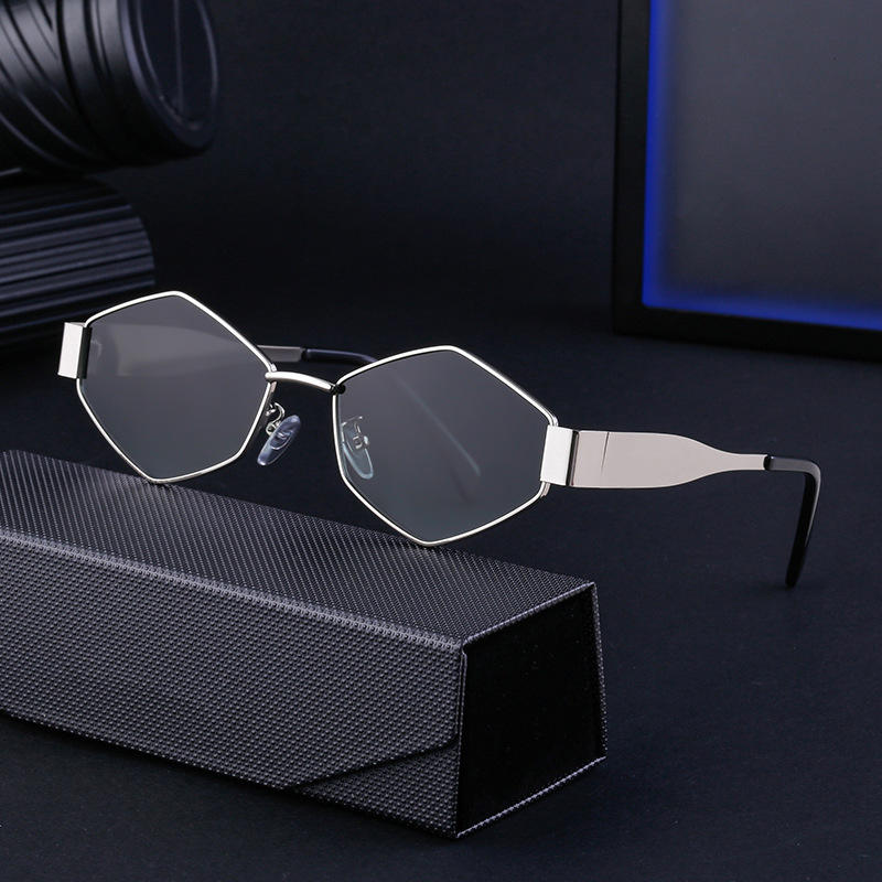 Lunettes de soleil en métal irrégulières de style européen pour femmes, monture dorée, verres PC, protection UV400, emballage en boîte, origine Taizhou