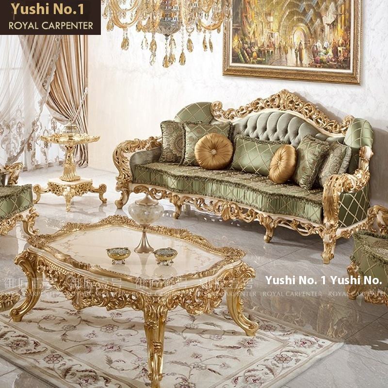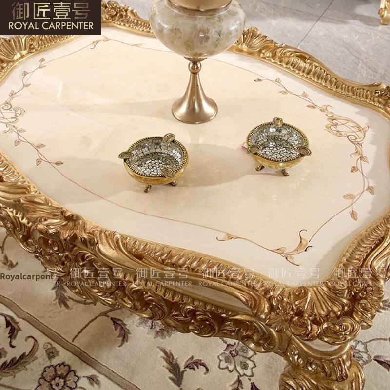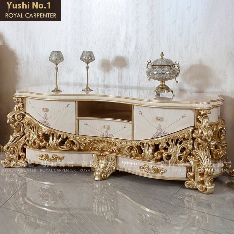Meuble TV et table basse combinés en bois massif doré de style européen, sculptés et décoratifs, pour le salon