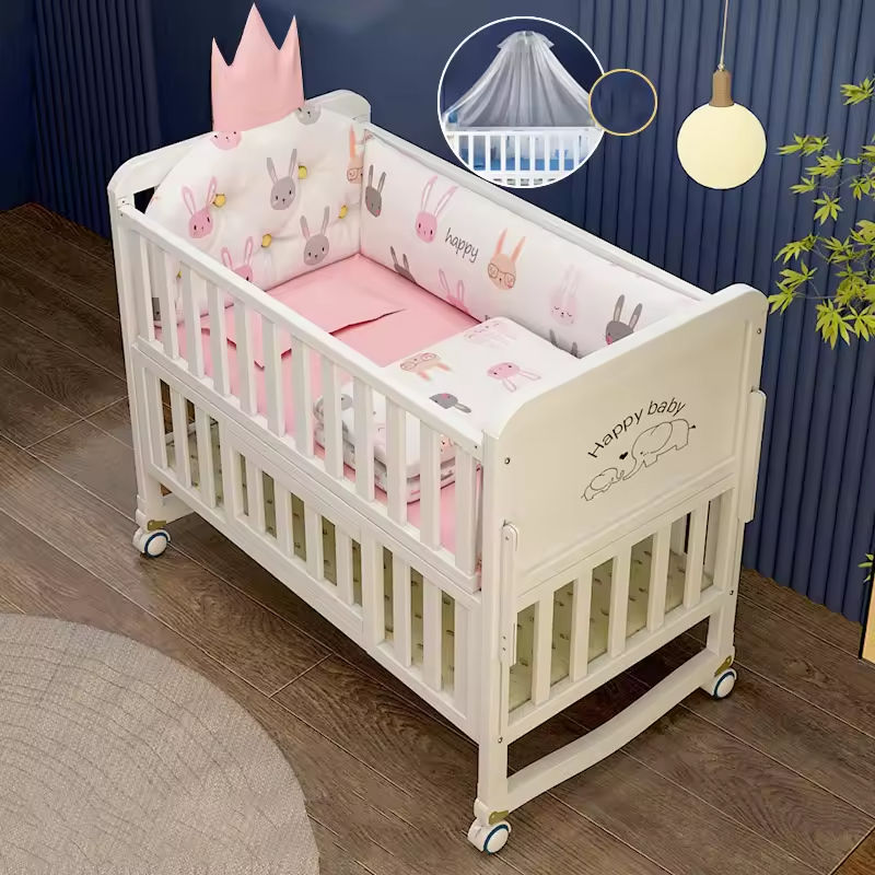 Lit bébé en bois massif multifonctionnel réglable de style européen confortable avec un ensemble de literie