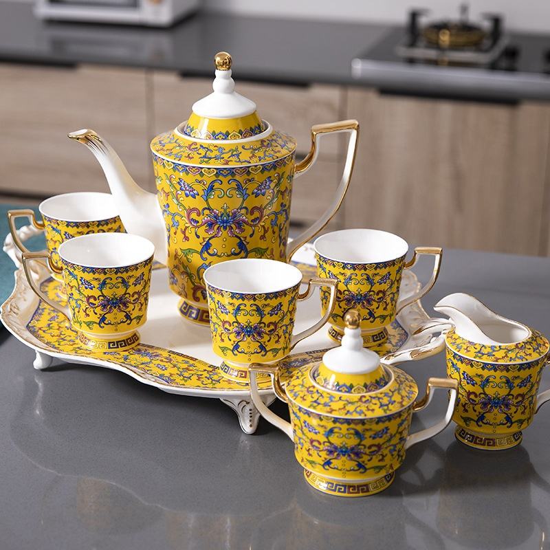 Service à café et thé de l'après-midi en émail jaune, style vintage européen