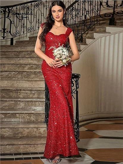 Robe de soirée longue à col en U, couleur unie, avec bretelles à paillettes, taille haute, style sirène, pour femmes européennes, américaines et du Moyen-Orient.