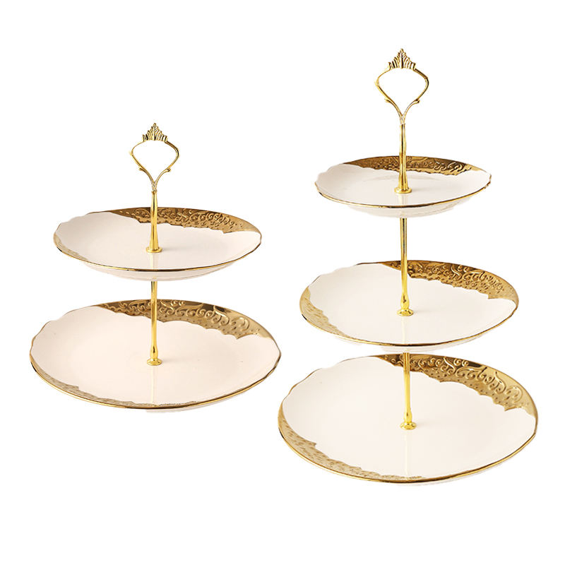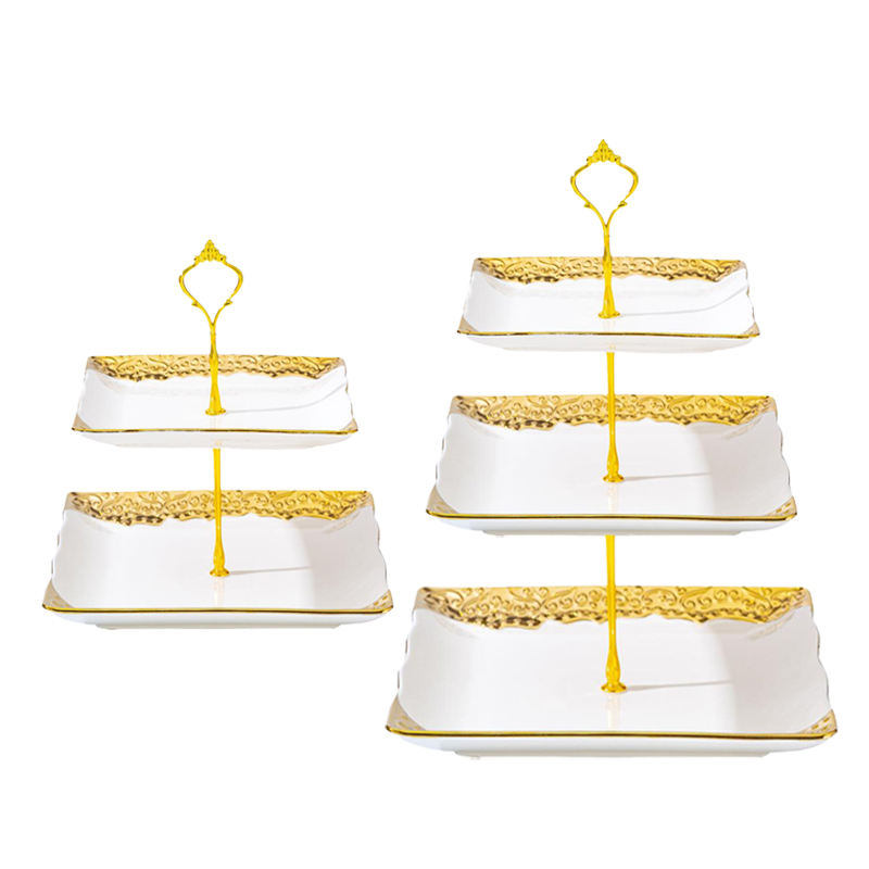 Plateau à fruits en céramique à 3 étages de style européen, décoration dorée, support à dessert, plateau à gâteau, support carré à fleurs en relief avec bord doré