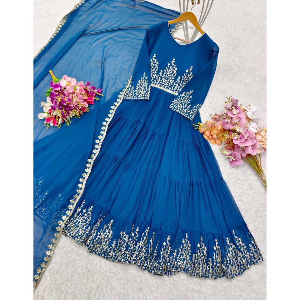 Robes de soirée, magnifique robe à volants et dupatta avec des broderies complexes et des sequins pour les fêtes