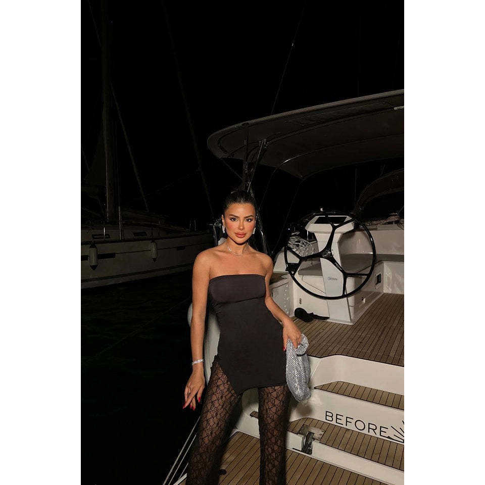 Robe de soirée et de nuit midi drapée transparente en "Lenta moda" avec perles blanches et pierres brillantes