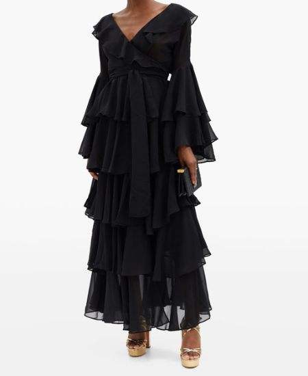 Soirée Femmes Designer En Mousseline De Soie À Volants À Manches Longues Col En V Uni Noir Maxi Robe Printemps Dames Robe