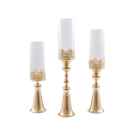 Bougeoir de trois tailles différentes en métal doré poli avec cheminée en verre pour la décoration intérieure