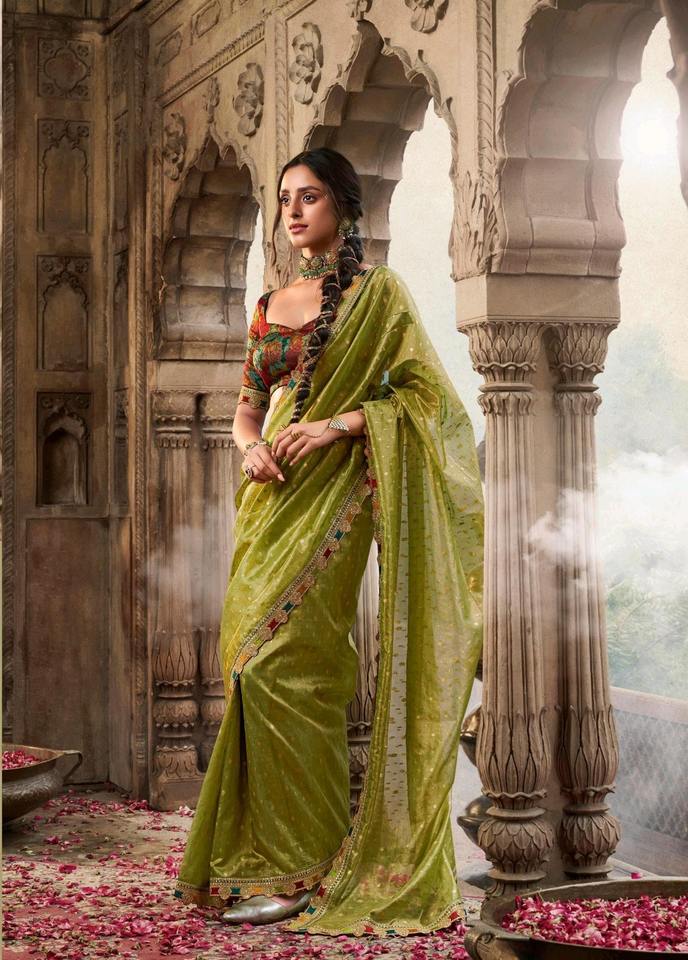 Evergreen Design Tissue With Multicolored Lace Saree