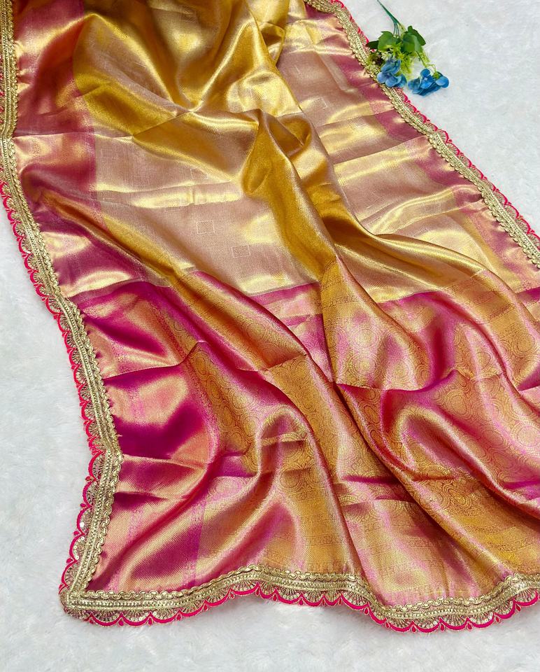 Nom du produit:Blouse en soie douce et attrayante en soie Banarsi Handloom Golden Saree