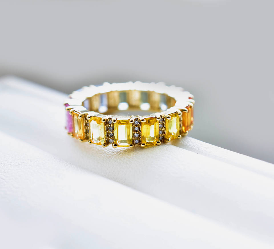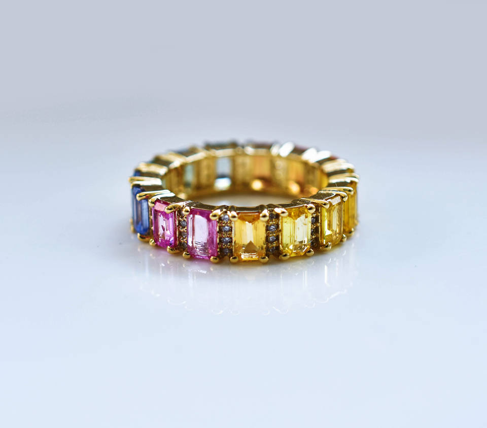 Bague d'éternité arc-en-ciel en or 14 carats avec saphirs naturels taille émeraude et diamants, modèle Prisme Royale, collection Everlasting Iris