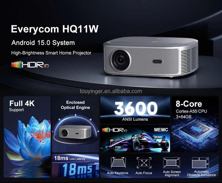 Projecteur domestique Everycom HQ11W 4K, puce V660 8 cœurs, 3600 lumens ANSI, DDR 4 3+64 Go, 1080P Full HD HDR10+, vidéoprojecteur intelligent, cinéma intelligent