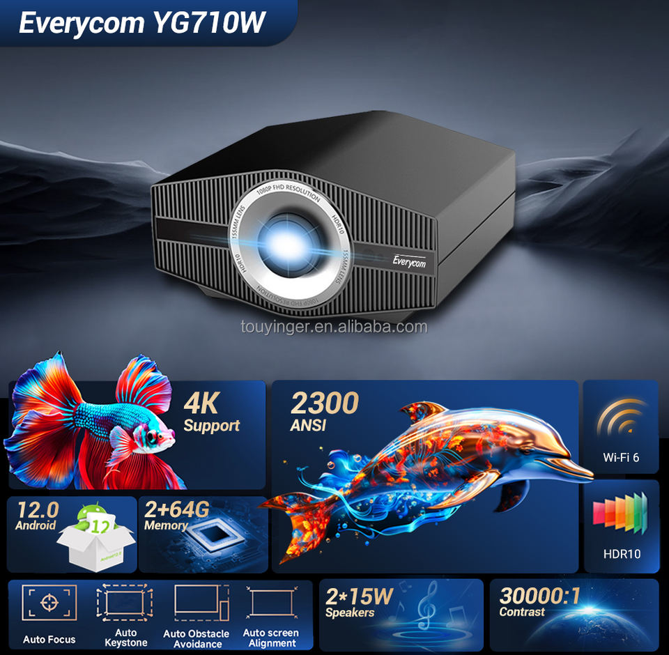 Projecteur Everycom YG710W Haute Luminosité 4K FHD 1080P Mise au Point Automatique Projecteur Haut de Gamme Vidéo Intelligente Cinéma Maison Faisceau Wifi Mini Projecteurs