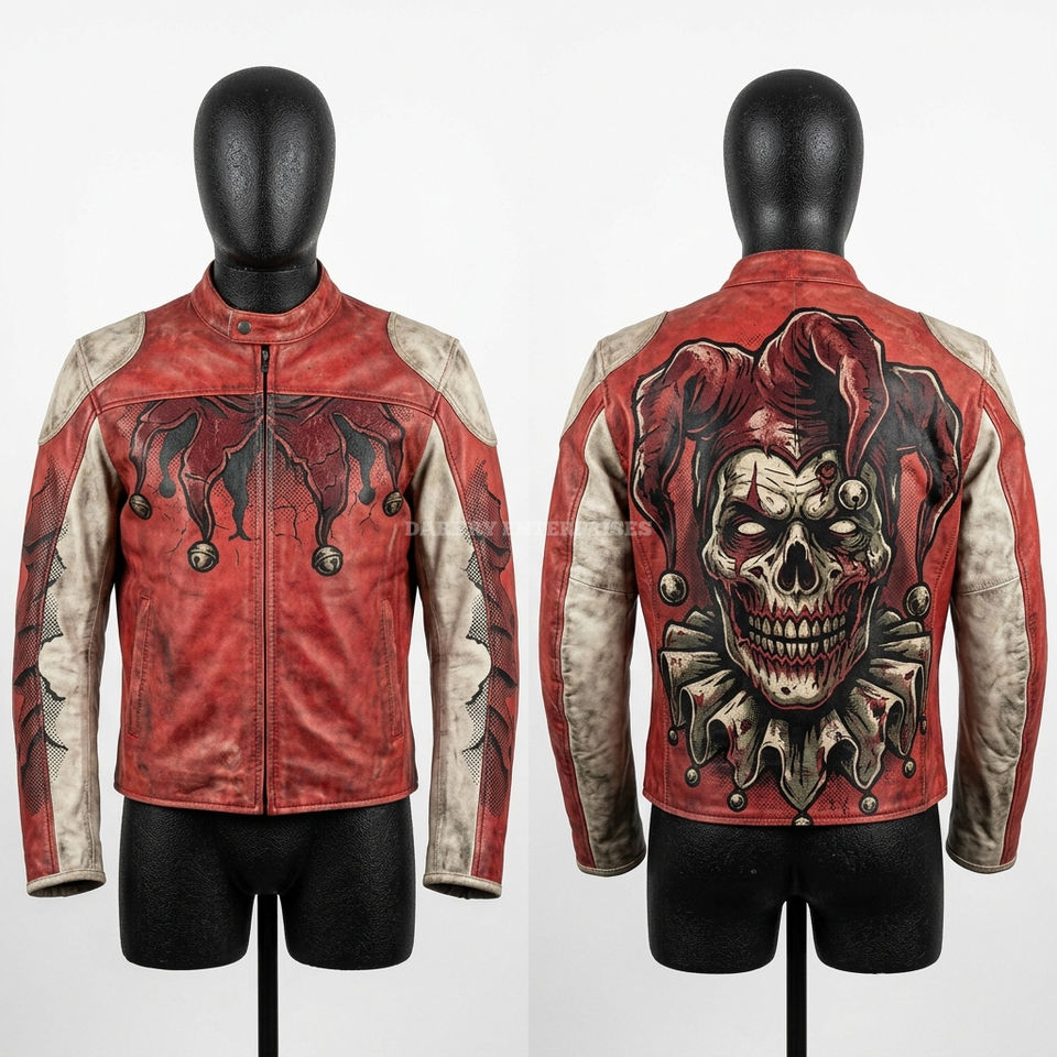 Veste en cuir de course Evil Jester, motif graphique rouge personnalisé, style clown zombie, pour motard, streetwear, carnaval, horreur, mode moto