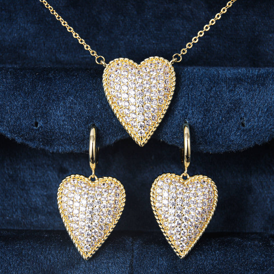 Exagérer personnalisé Joyeria Circonitas Forma Corazon ensembles de bijoux plaqué or Ice Out coeur Zircon femmes boucle d'oreille collier ensemble