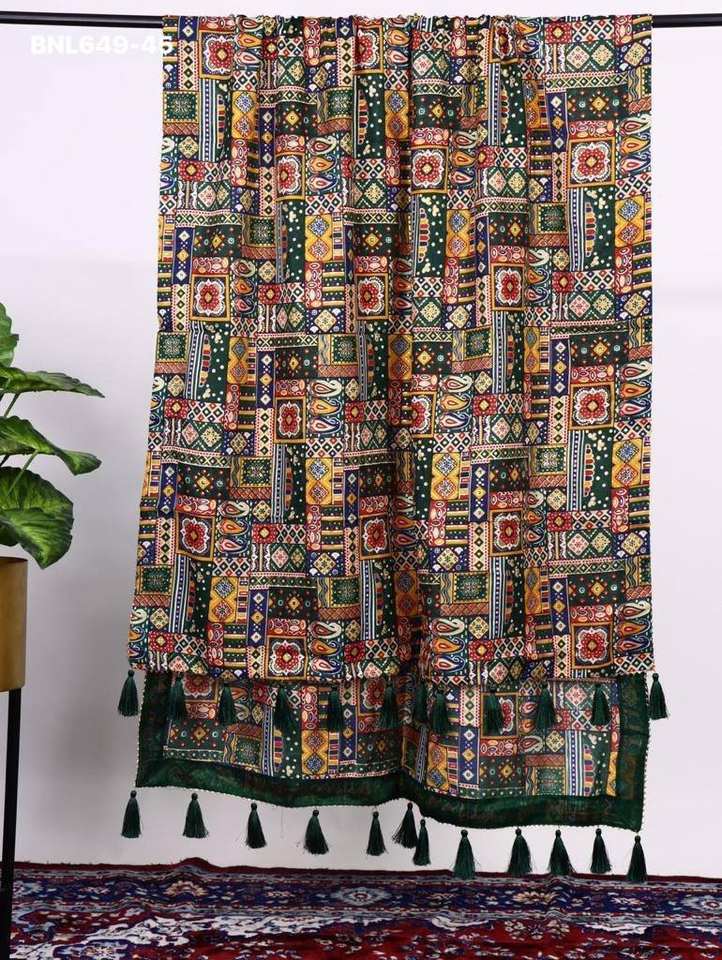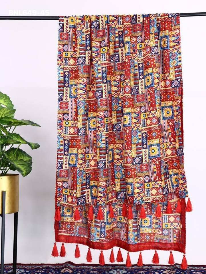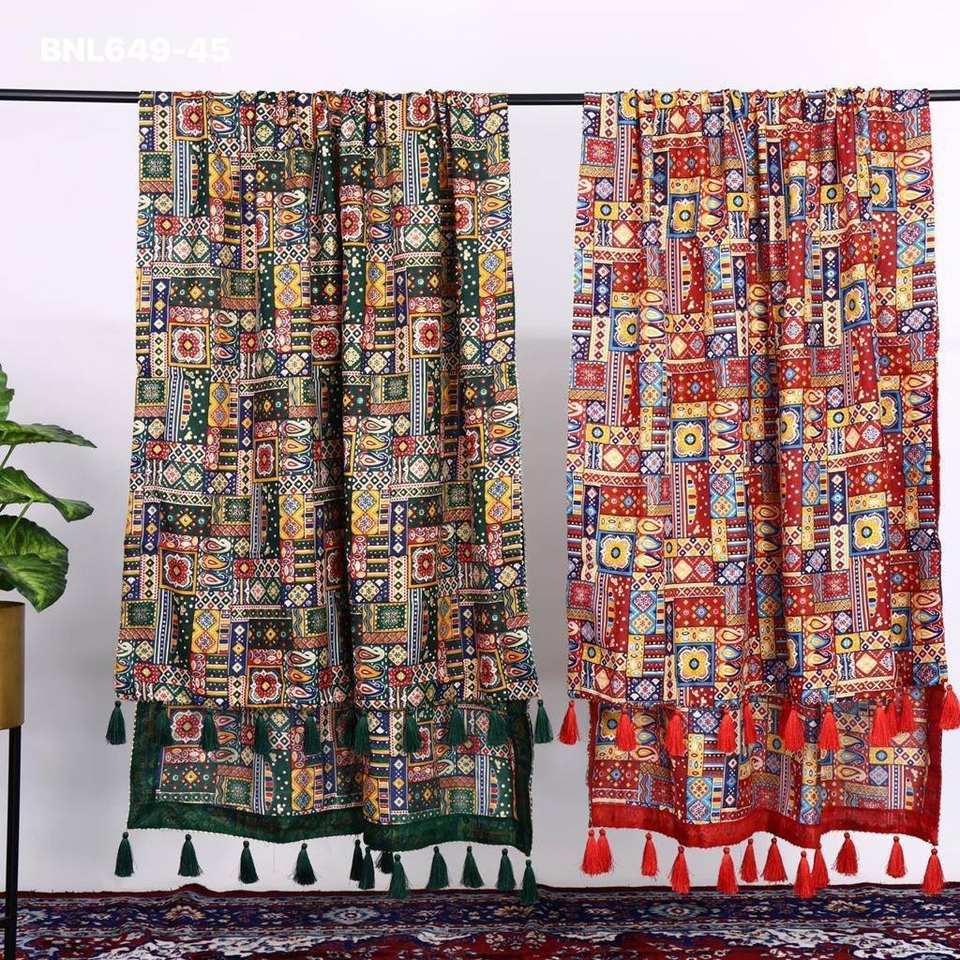 Fournisseur de dupattas en polycoton de qualité supérieure, dernière collection, avec motifs imprimés, travail en feuille métallisée et pompons, de Surat, à prix de gros.