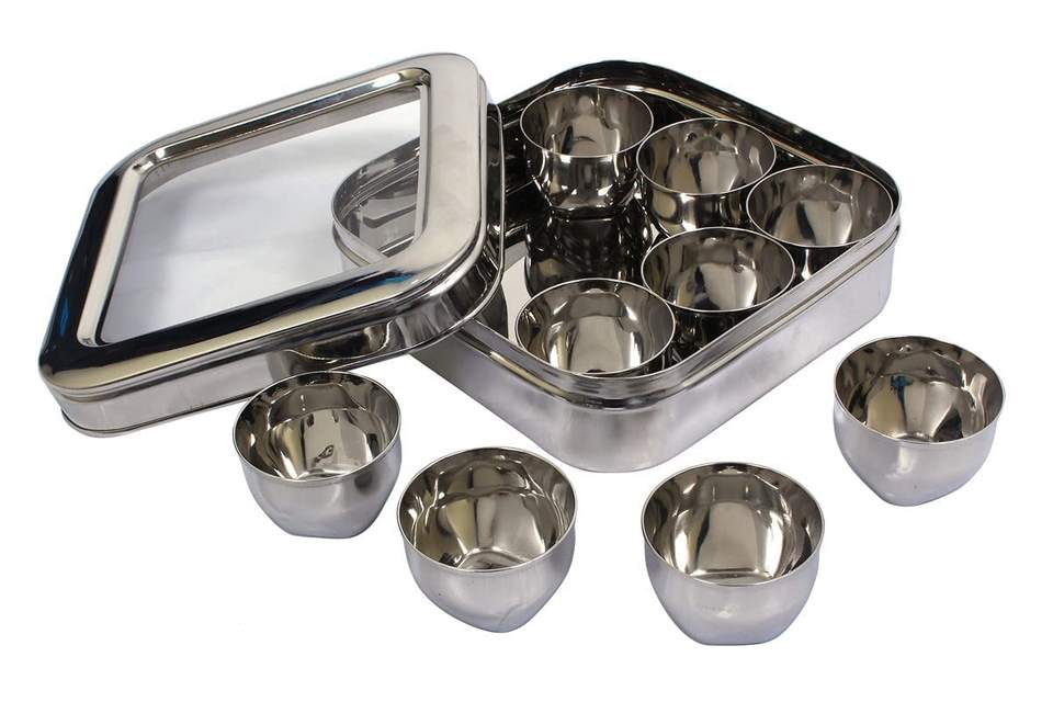 Boîte à épices carrée en acier inoxydable d'excellente qualité avec couvercle transparent et neuf récipients une cuillère