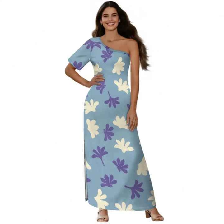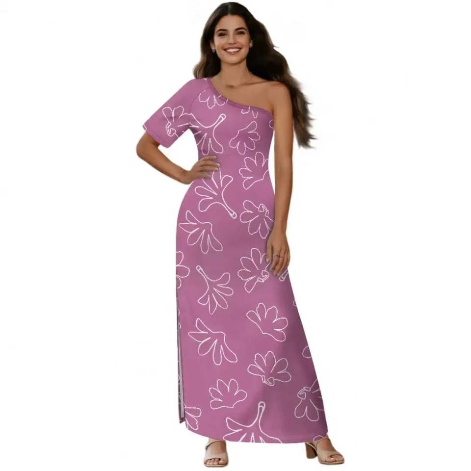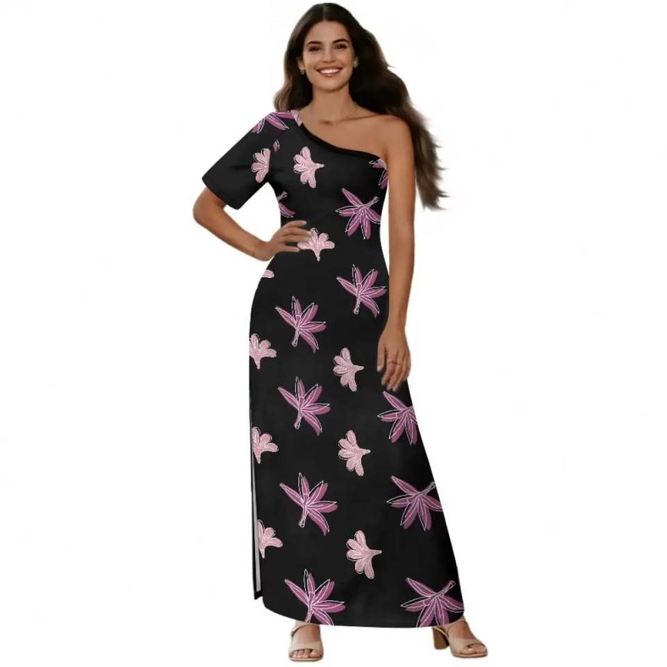 Robe longue décontractée pour femme, exclusive et personnalisée, style plage polynésien, lavable, à manches courtes, motif floral, pour l'été et l'automne, à épaules dénudées et fendue
