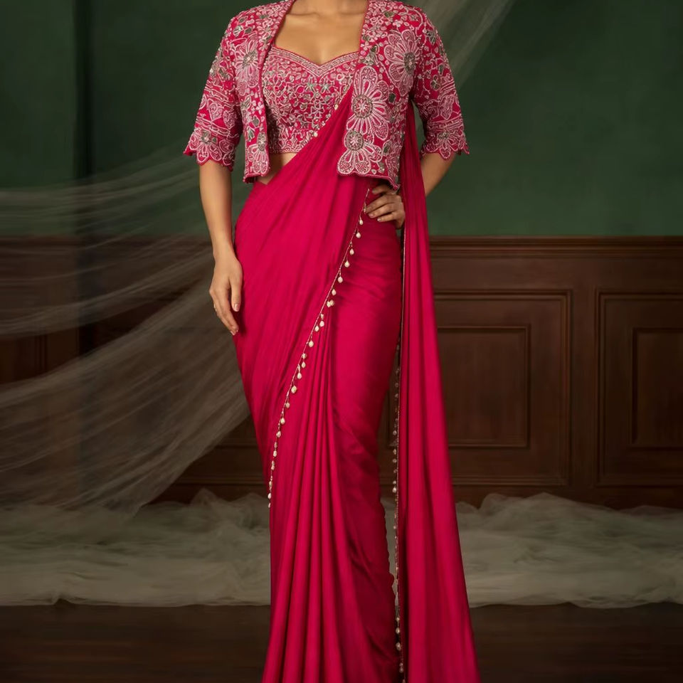 Sari en soie Creep prêt-à-porter, look de créateur exclusif, avec chemisier élégant, style tendance et moderne, tenue de soirée indienne modeste pour femme