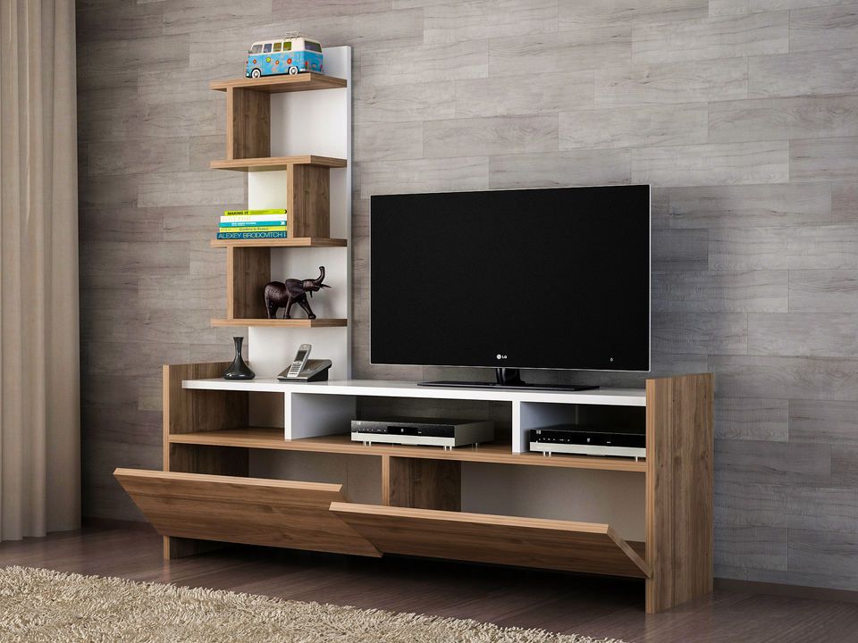 Meuble TV Aldora en aggloméré de luxe exclusif blanc-noyer de Turquie, best-seller