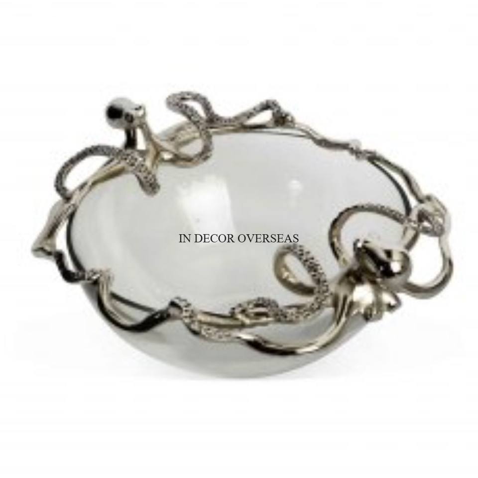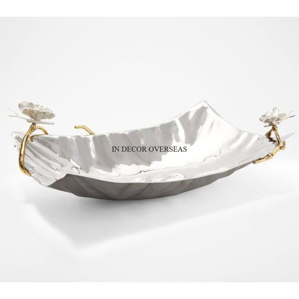 Centre de table de qualité exclusive en aluminium moulé de forme irrégulière, argent brillant et poli Plateau de service avec poignées plaquées or