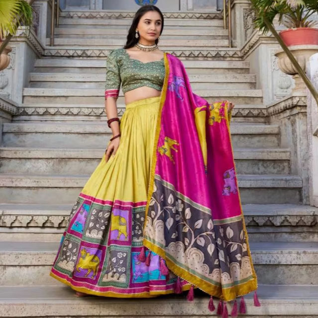 Exclusive Traditional Tussar Silk Kalamkari Print Work Lehenga Choli Stylish Bridesmaids Fancy Dress Design for Indian Pakistani