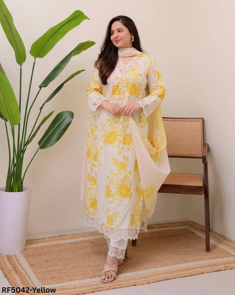 Ensemble kurti exclusif en coton rayonne trois pièces avec imprimé floral, col en dentelle, manches, pantalon droit et dupatta parfait