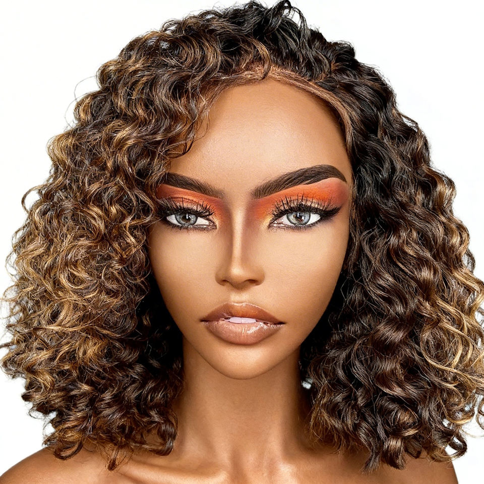 [Exclusivement pour Salons] Cheveux Humains Vierges Brésiliens Bouclés pour Mèches, Carré Court Couleur 4/27, Base en Dentelle 13x4, Densité 150%