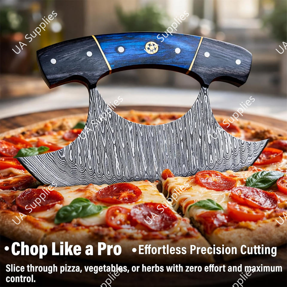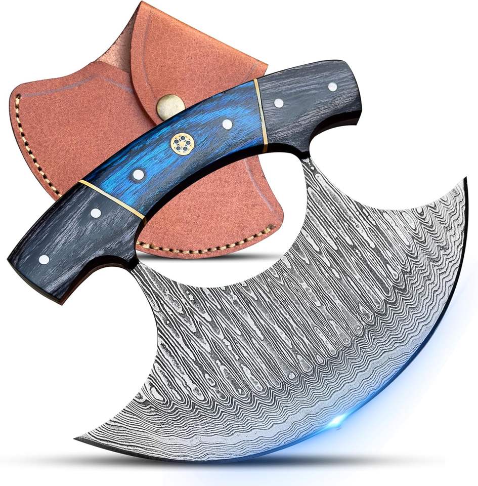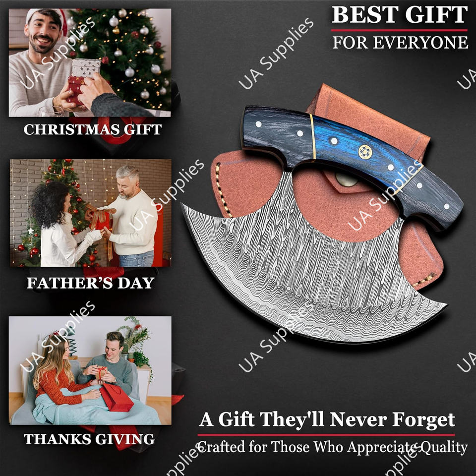 Couteau Ulu Moderne Ambidextre à Manche Coloré Exotique, Lame en Damas Forgé, Étui et Support Inclus, Coffret Cadeau Personnalisable