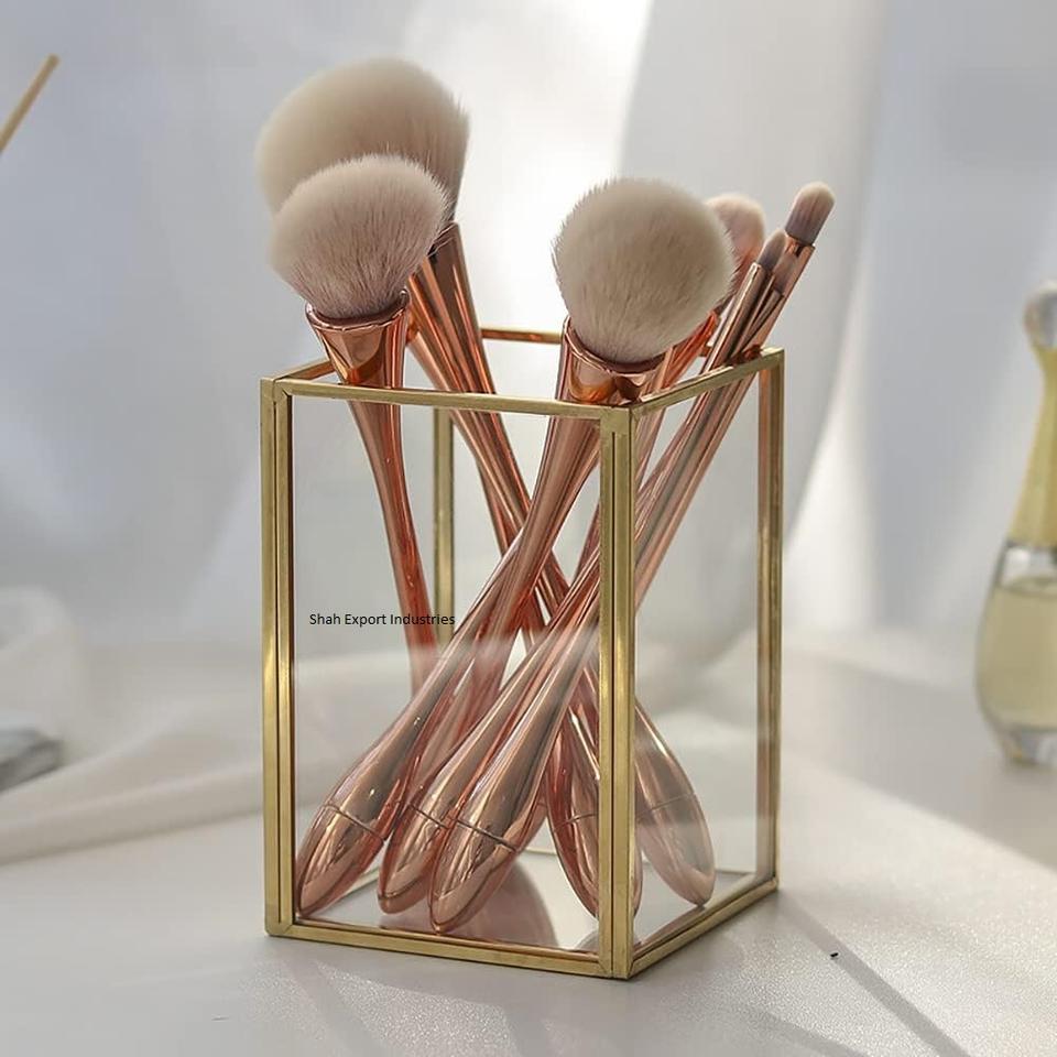 Conception coûteuse en laiton et verre porte-pinceau de maquillage bijoutier organisateur avec miroir Base or porte-pinceau de maquillage