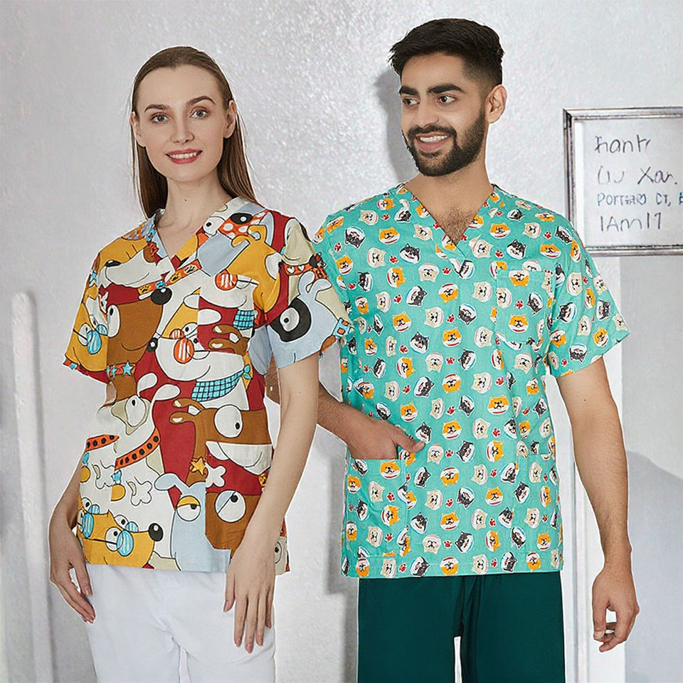 T-shirt unisexe à col en V et manches courtes, imprimé dessin animé créatif et original, pour personnel médical, uniforme de salon de beauté et d'hôpital, tenue de travail