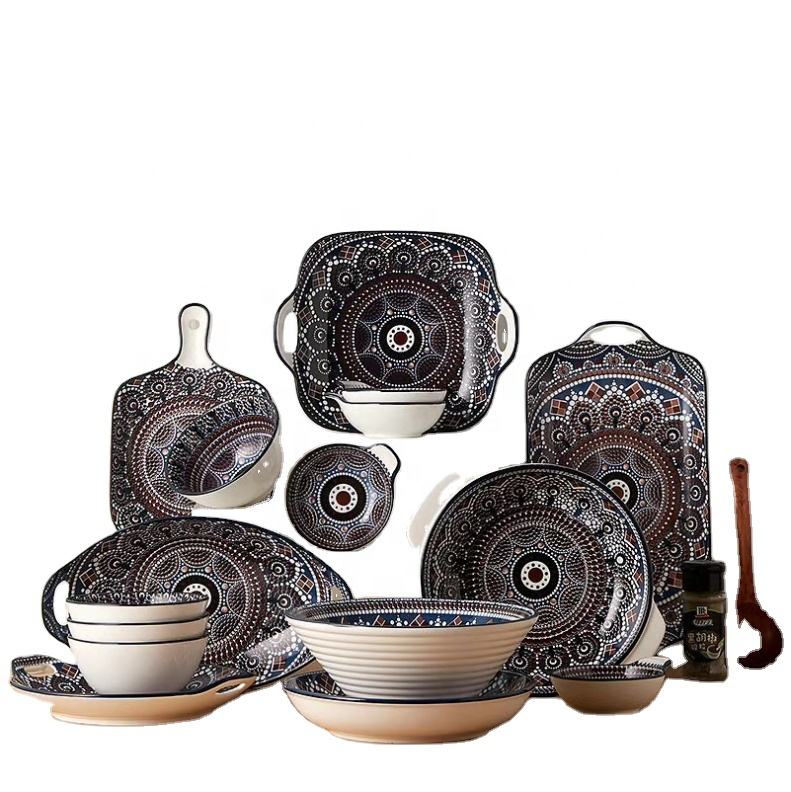 Ensemble d'assiettes et de bols en porcelaine durable à motifs scéniques de style bohème pour l'exportation