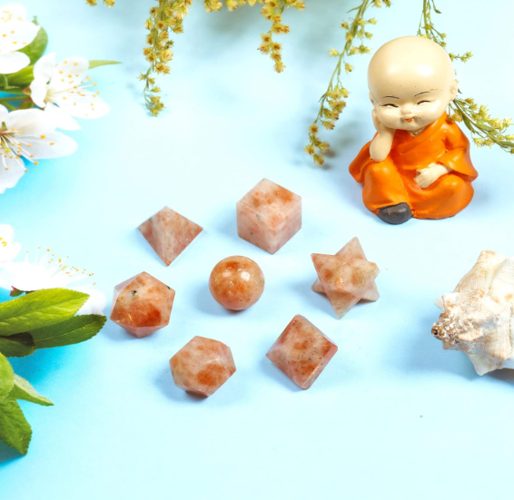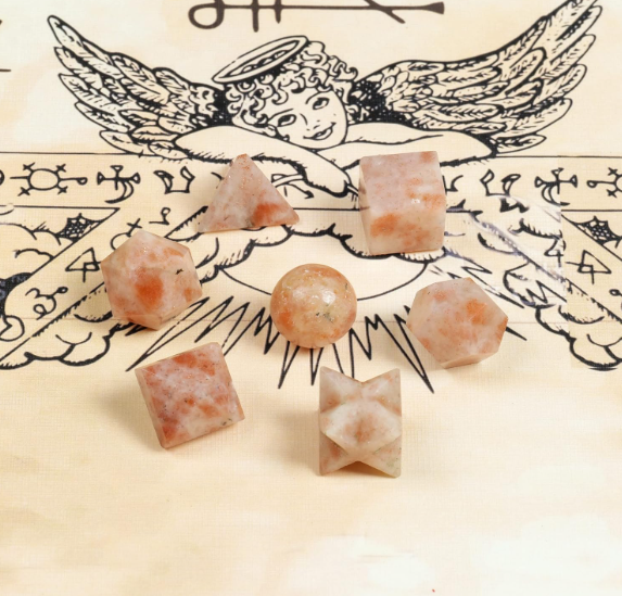 Ensemble de solides plaquoniques en pierre de soleil Offre Spéciale naturelle de qualité supérieure, géométrie sacrée, ensemble de 7 pièces avec sac en velours
