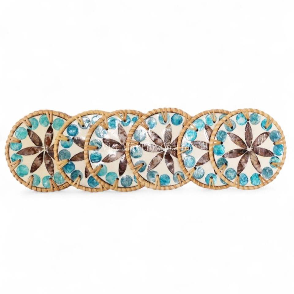 Export Wholesale Mother of Pearl Coaster with Rattan Weaving Detail for Dining Table Use and Interior Styling