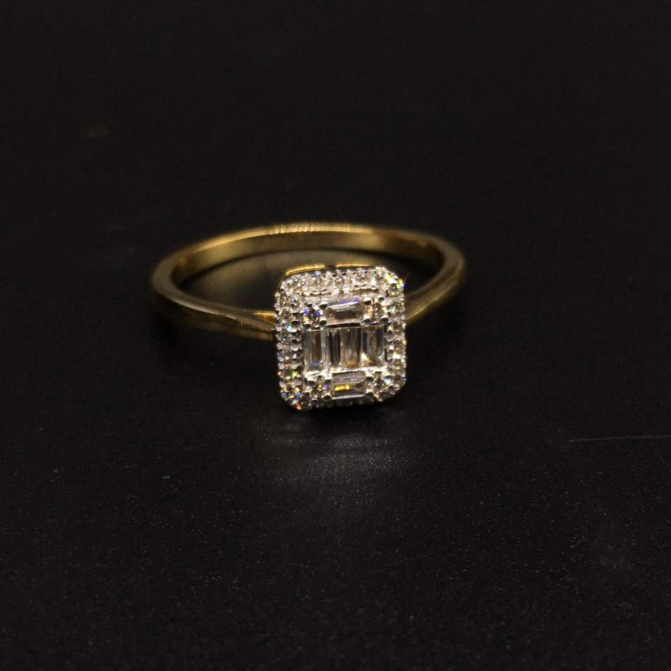 Bague de fiançailles exquise en or 14 carats avec pièce maîtresse en diamant baguette et bague halo incrustée de diamants étincelants