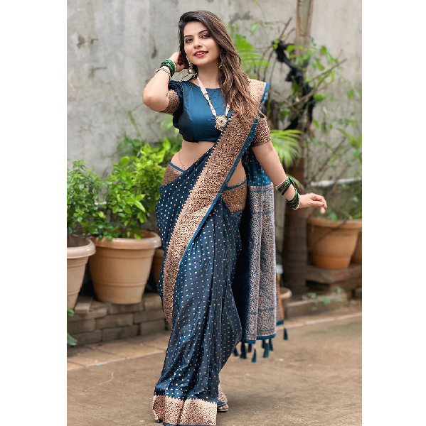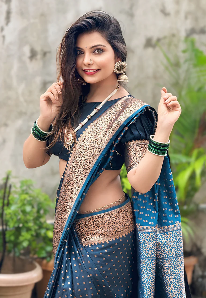 Sari en soie Banarasi Katan bleu foncé, tissage traditionnel Zari, vêtement de mariage de luxe, tissage Zari pour mariages et festivals